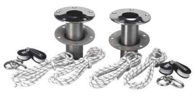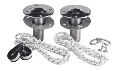 Le modèle 100 kg comprend : 2 bossoirs de tube 40 mm, 2 poulies, 2 mousquetons et 2 x 3 m de cordage.