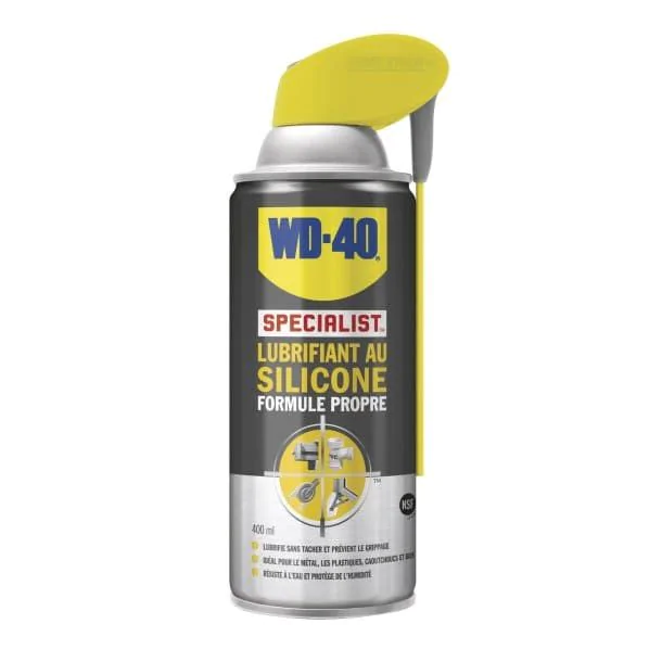 Le Lubrifiant silicone WD-40 est une lubrifiant anticorrosion et anti-humidité extrêmement efficace résistant jusqu’à 200 °C.