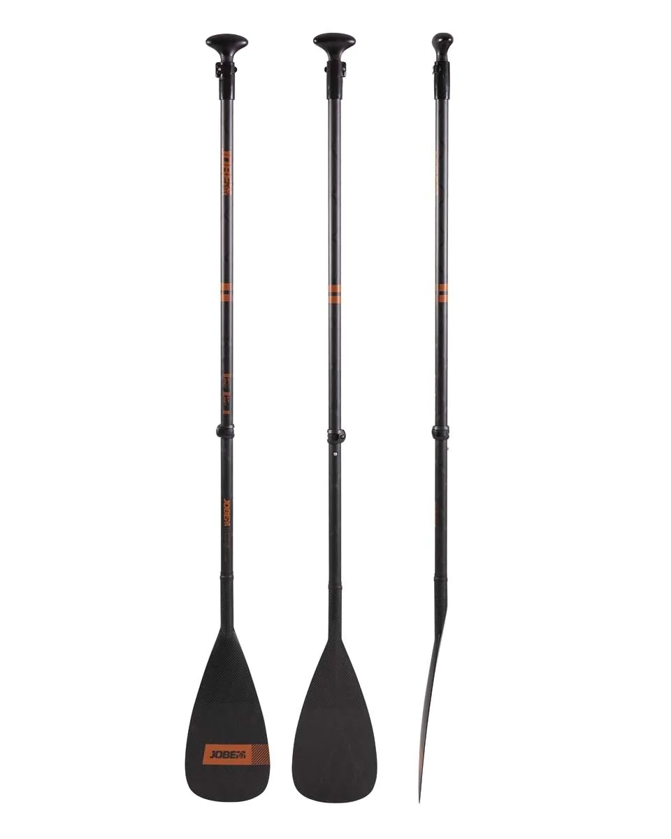 La pagaie est démontable en 3 pièces pour un transport plus pratique et un clip avec levier permet de régler la hauteur. Celle-ci est ajustable de 180 cm à 220 cm. Pour plus de confort, Jobe a également mis une poignée en T en carbone.