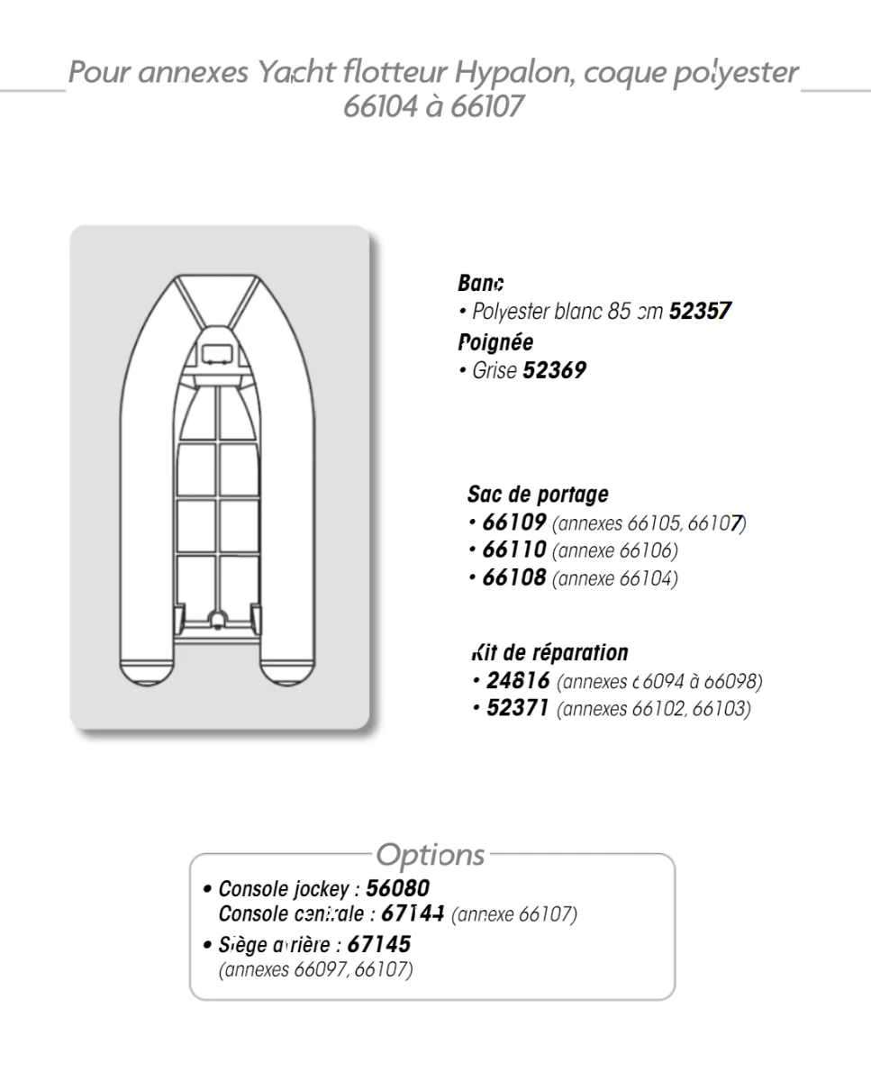 Retrouvez toutes les Pièces pour Annexe Yacht flotteur Hypalon coque Polyester Plastimo, des support pagaie aux sacs de portage.