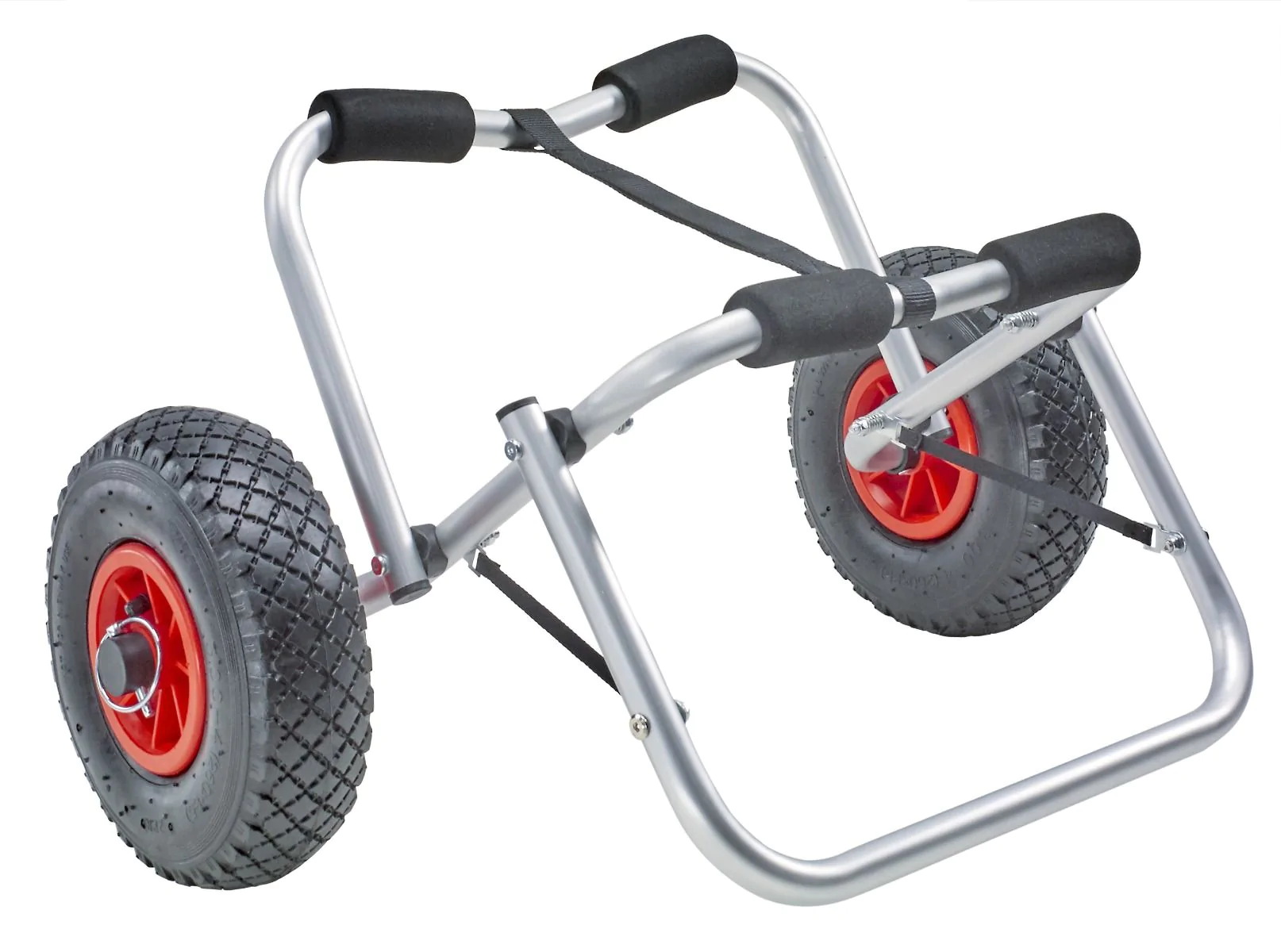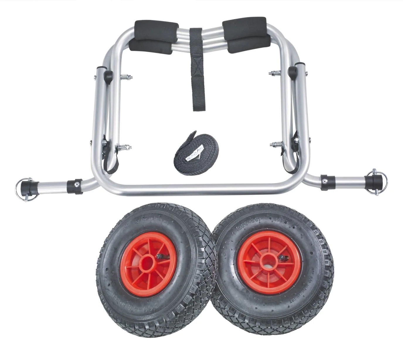Ce chariot est complet et dispose de tout ce dont vous aurez besoin : des coussins de protection, une sangle de fixation, une béquille de stockage, des roues gonflables larges et hautes pour s’adapter aux terrains difficiles.