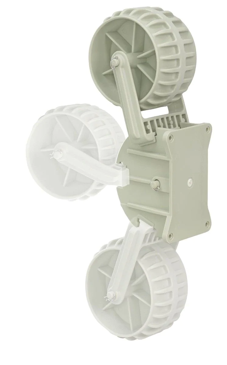 Ces roues rétractables en plastique on la possibilité de se bloquer à l’aide d’un système avec ressort dans trois position différente, permettant ainsi de s’adapter à chaque situation.